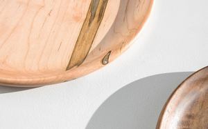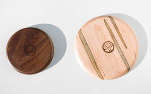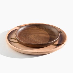 Handmade, solid wood plate set perfect for serving cheese, charcuterie, and all manner of snacks. Finely finished pieces made of solid ambrosia maple and walnut with pieces of natural Cerrillos turquoise set into the wood's tiny, natural imperfections.