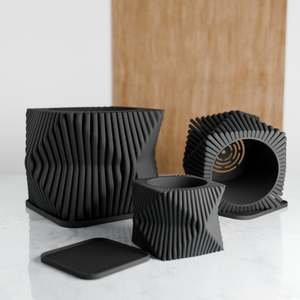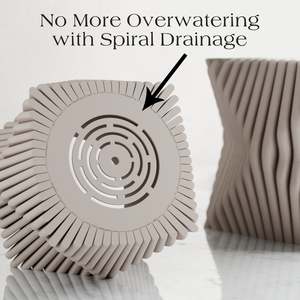 Sizes: Large: Height: 6.5 inches | Width: 9.5 inches | Depth: 9.5 inches | Opening 6 Inches Medium: Height: 4.8 inches | Width: 7 inches | Depth: 7 inches | Opening 4.5 Inches Small: Height: 3.4 inches | Width: 5 inches | Depth: 5 inches | Opening 3 Inches The TIDE planter was inspired by our TIDE vase design. It was created to embody the graceful movement of ocean waves, translating that fluidity into a modern, sculptural design. Its twisted silhouette and ribbed texture bring a sense of calm and elegance to any space, serving as a captivating centerpiece for your floral arrangements. Perfectly fitted drip tray saucer included! Made from 98% Plant-Based Materials | BioPlastic & Wood Fibers.