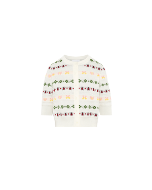 100% extra-soft pure cotton jacquard knit cardigan featuring whimsical good-luck charm motifs: ladybug, four-leaf clover, flower, butterfly, and heart. Designed with elbow-length sleeves, a round neckline, and button-front closure. A ribbed waistband creates a flattering fitted silhouette. Care: 100% pure extra-soft cotton. Crafted in Italy.