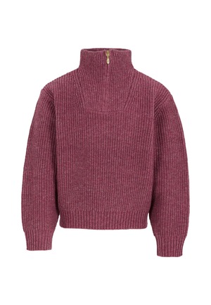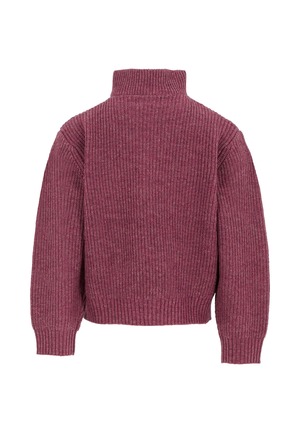 Girls > Clothing > Topwear > Sweaters & Sweatshirts Purple wool blend sweater with long sleeves, a turtleneck, a front zip, and ribbed cuffs and hem. Embellished with a logo2 patch on the side. 50% Wool, 50% Acrylic. Hand wash.