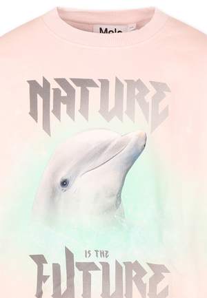 Girls > Clothing > Topwear > Sweaters & Sweatshirts Pink brushed sweatshirt in GOTS certified organic cotton, featuring long sleeves, crew neck, and ribbed cuffs and hem. Embellished with a dolphin print and text on the front. 100% Organic cotton. Machine wash at 30C.