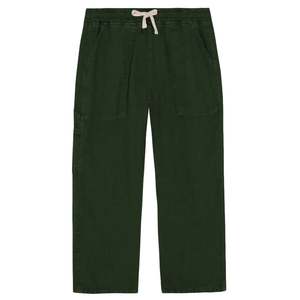 The Andersen Pant in olive by MONADIC delivers casual comfort through a wide straight-leg silhouette crafted from sturdy 10 oz bull twill. Stone-washed for an instant vintage aesthetic, the fabric feels broken-in from day one. An elastic waistband paired with a chunky cotton drawstring ensures an adjustable fit, while reinforced bar tacks on dual exterior hand pockets and carpenter's pockets on the right thigh provide both function and durability. Cropped to the ankle with generous room for movement, this Los Angeles-made pant balances utility with effortless style.