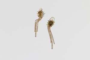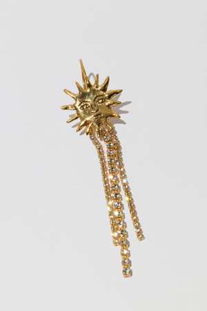 Sun motif crystal drop earrings available in 18K Gold Plated. Featuring crystal rhinestone chain. Ear wire post is in a coated Sterling Silver material for comfortable wear. Handmade in California.