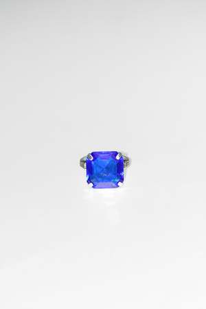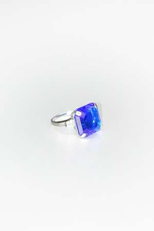 By Mondo Mondo Sterling silver ring with custom, hand-cut 14*14mm glass stone with ornate band details. Materials: .925 sterling silver, glass color: bliss