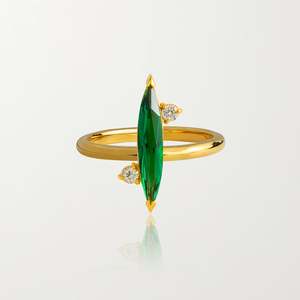 Sizing Help? Sleek and sophisticated, the Verde Ring is crafted with a large emerald marquis and lab-grown diamonds to bring a pop of color to your finger stack. Perfectly paired with any of our emerald jewelry. Composition: - Lab-Grown diamonds - 0.024 carats. - Green marquis colored stones - 18K Gold Vermeil: Our 925 Recycled Sterling Silver is coated in the highest quality thick gold vermeil. This guarantees top quality and long lasting product that you can wear in all conditions. - Hypoallergenic, water resistant. Style with: The Three-Tiered Floater Choker in Emerald, The Jet Set in White