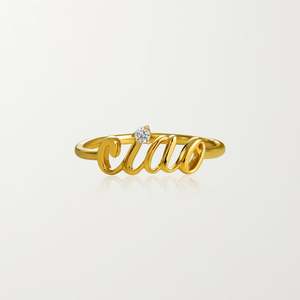 Sizing Help? Say it in diamonds with a team favorite! The Ciao Ring is born out of love for our Ciao motif seen frequently throughout the brand. Wear the ring on its own or create a stacked look with your other favorite rings. Composition - Lab-Grown Diamond - 0.035 carats - 18K Gold Vermeil: Our 925 Recycled Sterling Silver is coated in the highest quality thick gold vermeil. This guarantees top quality and long lasting product that you can wear in all conditions. - Hypoallergenic, water resistant. Style with: The Ciao Diamond Necklace, The Ciao Studs, The Ciao Beanie in Navy