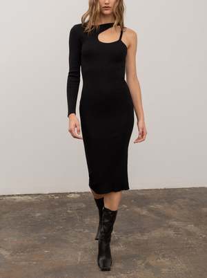 Beautiful black knit one sleeve dress with neck cut-out detailing and midi length skirt. 77% viscose, 23% polyester
