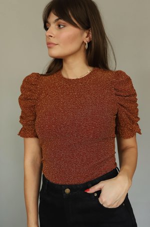 Beautiful burnt orange metallic top with ruched sleeve detailing, round neck and stretchy fabric. - length: 24" - 62% poly / 30% metallic / 8% elastic / imported - dry clean only