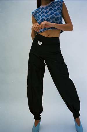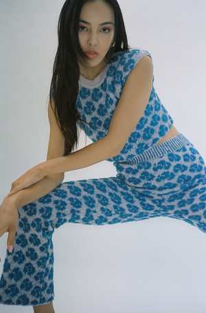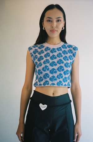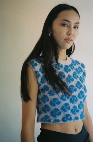 Luxuriously thick and soft hand-knit top. Super cozy and comfortable. Ribbed at the neck. Featured in a lovely dusty pink and vibrant blue shade. Mozhdeh is deeply informed by the communities and personal experiences gathered from their trips to Peru, you can see this translated into each and every garment. Worn with the Annika Inez Heart Belt.