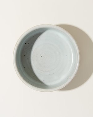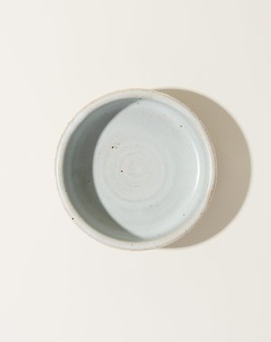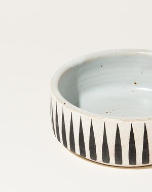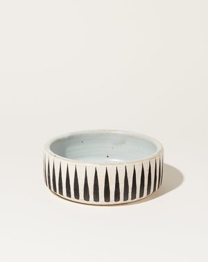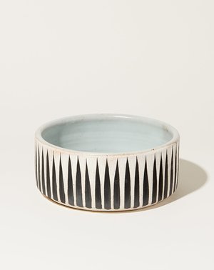 Wheel thrown stoneware dog bowl hand painted with Black Stripes. Glazed Temple White interior. Dimensions: Available in Small [6.5" by 2.75"] and Large [8" by 3"] Material: Ceramic Origin: Handmade in New York City Why we Covet: All of Michele's pieces add an element of warmth to any home or garden scape