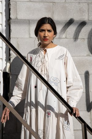 Short oversized dress round neck and sculptural sleeves in our off-white Organic Cotton poplin Chapelle Embroidery. Front neck slit with delicate ties. Gathered ruffle at front hem. Gathers at back yoke. **Each piece is unique - all embroidery placement varies***