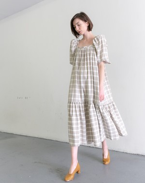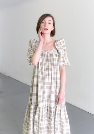 Peasant-inspired dress with ruffle hem and removable belt in curtain viscose plaid. Square neckline and with exaggerated puff sleeves. Side-seam pockets. Slips on over head to be worn. Unlined. CONTENT | 100 Viscose Made in Poland, Fabric from Italy
