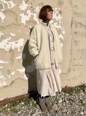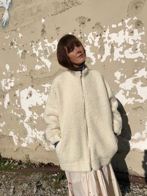 Unique and beautiful oversized bomber jacket in a natural shearling with dropped shoulders, stand collar and front riri zipper closure. We just love the lining in pale pink viscose. Also available in Navy. Details: - 60 Virgin Wool - 20 Polyester - 20 Acrylic - Lining 100 Viscose - Made in Lithuania Fane is 5'8, size x-small wearing a size x-small
