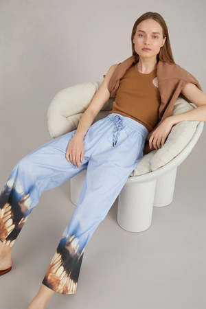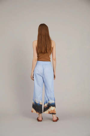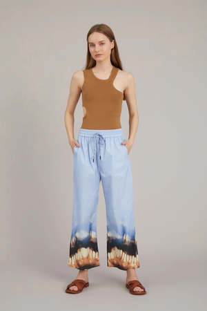 The Voice Pants in Blue by Munthe are a loose, cropped trouser crafted in an organic cotton with a cool tie dye print, and elastic waist with ties and side pockets. Pair these easy pants back to the matching Volta Top for a matching set. - 97% Organic Cotton 3% Elastane