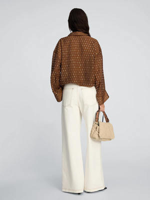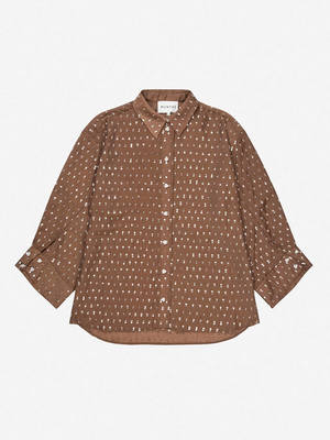 The Bjarka Blouse by Munthe is a unique shirt featuring an oversized fit and discrete sequin details. It is designed with a classic collar, front button closure, and long sleeves with a dropped shoulder and wide cuffs, plus flower buttons to elevate the style. Wear with tailored trousers and heels for a subtly glamorous evening look, or with jeans and flats for an elevated weekend look. The model is 176 cm and wears a size 36. Details - Brown blouse - Subtle sequin design - Button-down with flower buttons - Classic collar - Dropped shoulders - Wide sleeves with cuffs - Loose fit Fabric & Care Composition: 100% Polyester.