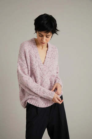 The Arcar Sweater in Pink by Munthe is a loose-knit, deep v-neck top with a dropped shoulder and ribbed finish. - The model is 5'9" and wears a size 36.
