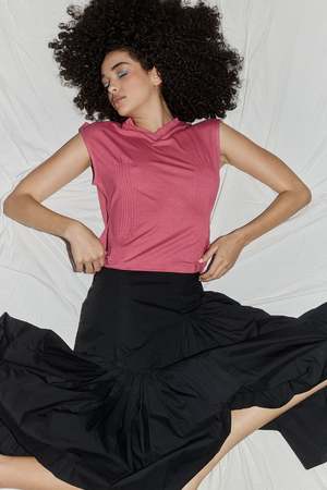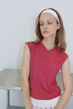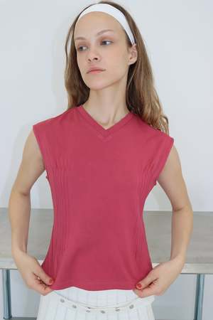 COLOUR | BERRY - Also available in BLACK | WHITE INTRO | A modern take on a nostalgic classic, this sleeveless tee features a sporty V-neck and pin- tuck detailing for a sleek, contemporary finish. Crafted from a soft viscose blend. Details Fabrication: 92% Viscose 8% Spandex Oeko-Tex certified fabric Sports V-neckline Pintuck detailing at the front and Back Extended Shoulder design Relaxed fit Fit Guide The fit of this piece is true to size. Beatrys is wearing a size XS Beatrys' Measurements: Height: 173cm | Bust: 85cms | Waist: 68cms | Hips: 98cms Size chart/measurements below