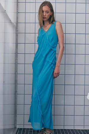A fluid bias-cut dress with soft, angled paneling that follows the bodys line. Sheer overlays create gentle movement through the skirt, giving the silhouette ease and quiet structure. Details - Bias-cut for a natural, elongated drape - Layered panels that wrap softly across the body - V-neckline with clean, minimal finishing - Sheer hem panel for light movement - Midi length Jersey: 100% Polyester Fit Guide Diana is wearing a size S (AUS 8). Diana's measurements: Height: 179cm | Bust: 85cm | Waist: 60cm | Hips: 88cm.