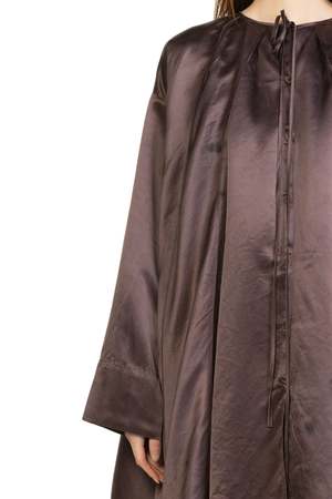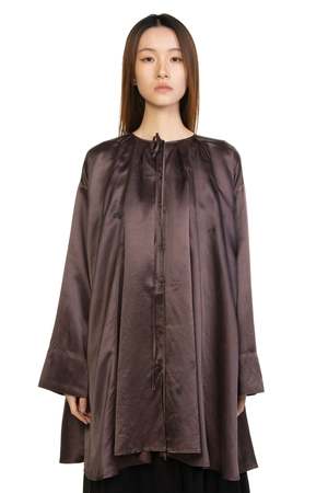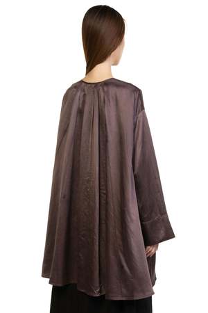 Yu Qun believes that everyone's character is multi-faceted and expresses spiritual independence. Fine hand-stitched threads, old mottled colours and patterns, and unconventional cuts are what Mute Dance has been exploring. The leaves and stems of fresh plants and berries, dried medicinal materials, old metals and more are combined with ancient traditional dyeing technology to dye fabrics and paper, as seen with the Purple Blouse. Mute Dance Purple Blouse in silk. Long sleeves. Button closure at front. Round neck. Drawstring closure at neck. Pleating at back and front. Signature silk fabric. Colour: Purple. Composition: Silk.