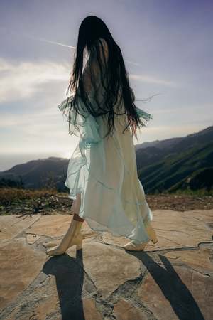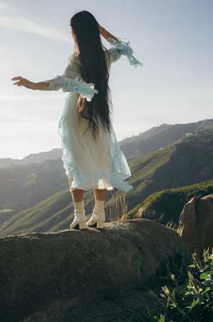 Silk wrap overlay robe with double ruffle sleeves and single ruffle hem. Elegant French seams. Angel Blue. 100% Silk. Lovingly made in Los Angeles, California with forgotten fabrics. Each garment repurposes leftover natural fiber fabric to give it a new and beautiful life. Only a few pieces of each style are produced. One Size.