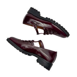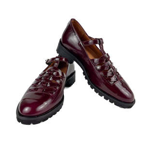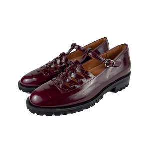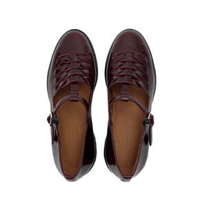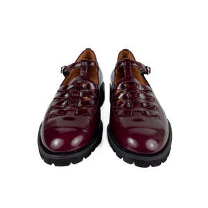 IMAI is a T-shaped Mary-Jane shoe with an intriguing woven detail. This shoe features a round toe in a deep burgundy shade with a shiny patent finish. Pair with some fun socks for extra style points! Uppers are made of cowhide with a suede detail at the toe. Natural cowhide lining. Removable foam insole. Non-slip rubber tread sole. Heel height is 3 cm.