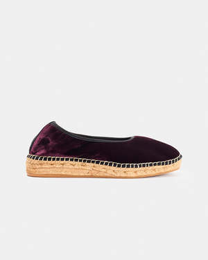 The Allium Espadrille by Naguisa is a ballerina-style espadrille featuring a velvet upper with elastic trim. The lining is fabric with foam for added comfort and a padded insole. The sole consists of a natural jute braid wedge with a rubber outsole. Square toe. Sole height: 3 cm. The uppers are hand-stitched to the sole, with each pair taking about 20 minutes to sew. Made in northern Spain through an artisanal process.