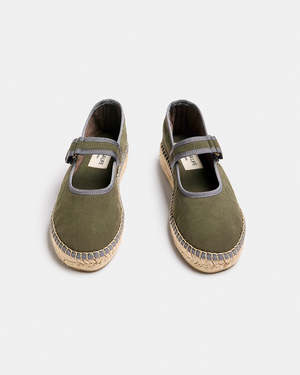 The Talo Espadrille by Naguisa is a Mary Jane-style espadrille featuring a synthetic upper with contrast trim and a velcro buckle closure. It has a fabric lining with foam for added comfort and a padded insole. The sole is made from natural jute with a wedge and a rubber outsole for traction. The shoe has a round toe and a 3 cm sole height. Handmade in northern Spain using artisanal methods.
