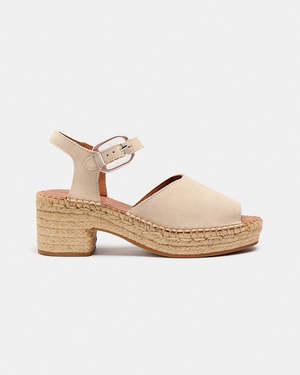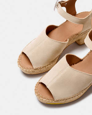 Var is a wide-band sandal secured at the heel with a metal buckle. The upper is made from suede leather. The footbed is padded with foam and lined in natural cowhide leather to improve breathability. The sole is made of jute with a wide heel and platform for greater comfort, and a leather outsole with anti-slip grooves. Total heel height is 7 cm. The straps are hand-stitched to the sole. The sewing time for a pair of espadrilles is about 20 minutes. Our espadrilles are made in Spain using an artisanal process. Fit and care - Var fits true to size. - The sole is made of jute: do not get the soles of your Naguisa wet. In case of contact with water, let them dry away from direct sunlight. - To clean the upper, lining, and insole, use a cloth dampened with water and/or a soft brush to remove dust. - To improve the aging of the leather, you can apply a colorless nourishing wax or cream. We recommend using products that are respectful of the environment. Additional details - SKU: 26VVAR818VAN - Made in Spain. - Pre-order item (SS26).