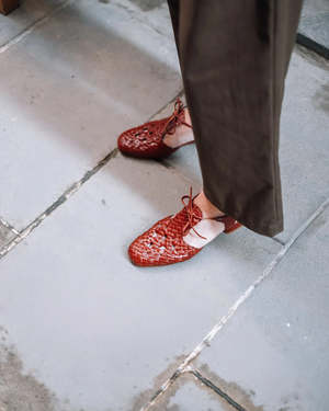Mays is a T-strap sandal with a closed woven toe and open heel. The upper is cow leather and the lining is goat leather. It adjusts over the instep with a tone-on-tone lace. The insole is cow leather to allow better breathability for your foot, and the sole is leather. The heel height is 3.5 cm, and the wide heel provides added comfort. Fit and care Mays fits true to size. 1. To clean the upper, lining, and insole, use a cloth dampened with water and/or a soft brush to remove dust. 2. To improve the aging of the leather, you can apply a colorless nourishing wax or cream. We recommend using environmentally friendly products. SKU: 26VMAY1MA1 Pre-order item.