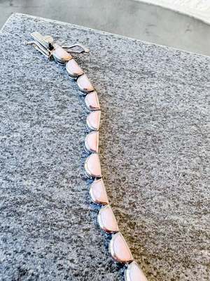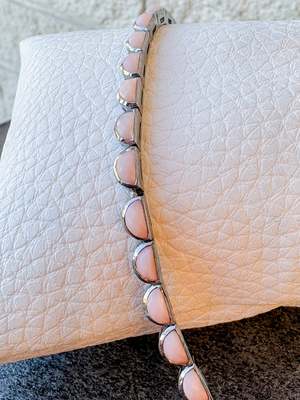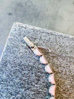 Pink opal and sterling silver with black rhodium finish. 6 3/4" in length. Open box clasp.