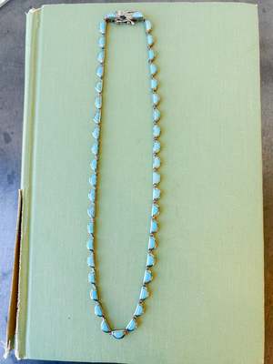 Turquoise and sterling silver necklace with black rhodium finish. 16" in length with an open box clasp.