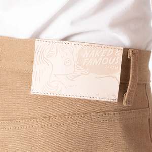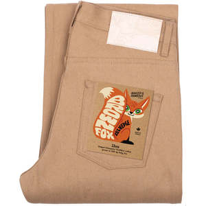 The Strong Guy Brown Fox Selvedge by Naked & Famous features 13oz Japanese selvedge denim made from organic brown FoxFibre cotton grown in California without dyes or bleach. This naturally pigmented fabric offers an eco-friendly alternative, soft texture, and warm earthy tones that deepen with wear. The Strong Guy offers a relaxed straight fit with a high rise, roomy seat and thigh, and a wide leg opening.