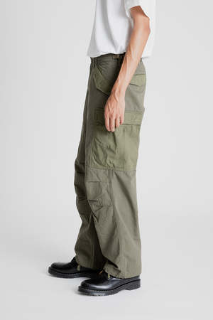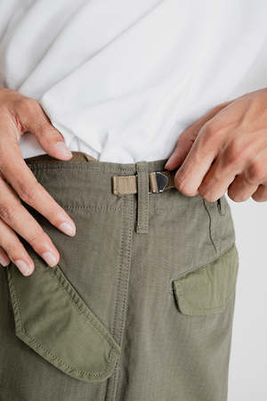 Nanamica Cargo Pants - Khaki Inspired by M-51 field trousers used by the US Army, Nanamica's Cargo Pants are built strong enough to endure whatever adventure you need them for. The Cordura fabric is resistant to scuffs and abrasions and is featured on both the main body as well as the accent pockets. Cut in a wide, straight fit for comfort, the pants also feature side adjuster tabs at the waist and drawstrings at the leg openings for extra customization.