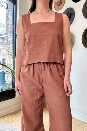 A boxy summer shell top with a square neckline, thick straps, and high low cropped length. Pairs back as a chic, summer weight set with the complimentary Koh Rong Lounge Pant or is a perfect little crop top to style with your favorite denim. Pull on styling. Crafted from dead stock cotton-linen blend fabric and ethically produced in Cambodia. Ethically made in Cambodia Cotton-Linen Blend Measurements: XS: Bust 36" | Length (from top of strap) 16.5" S: Bust 38" | Length (from top of strap) 17.5" M: Bust 40" | Length (from top of strap) 18.5" L: Bust 42" | Length (from top of strap) 19.5"