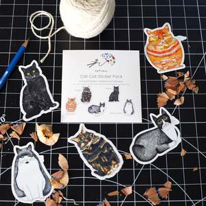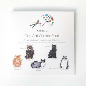 Elevate your personal style with this curated pack of five vinyl cat cat stickers, each hand-drawn with pencil detailing for a subtle, artistic touch. These waterproof stickers offer exceptional durability, adhering smoothly to various surfaces like water bottles and laptops. Designed to maintain their quality through dishwasher cycles, they provide a refined way for cat enthusiasts to elegantly customize their everyday items. Malcolm, Tobias, Margot, Jasper, Adam Jones 170226