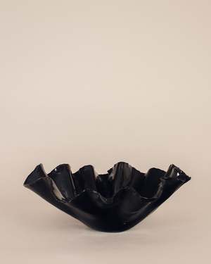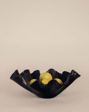 Large, paper-thin porcelain bowl with hand-torn edges. Its elegant, glossy black glaze adds a subtle shine, elevating anything it holds. Ideal for displaying fruit or serving at gatherings. DETAILS: 12 x 4.5 in | Porcelain | Handmade in Vancouver, Canada A multidisciplinary artist, Nathalee Paolinelli draws upon her Italian and Indigenous roots to create beautifully organic ceramics that capture the essence of nature. Each delicate piece shows the artist's hand in some way, making them truly unique.