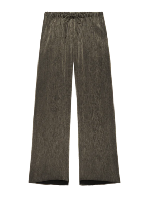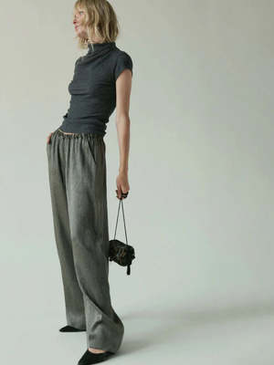 description: Comfort meets chic with these pants, featuring a shirred, elastic waistband, a spaghetti tie and slit pockets. fabric: 79% Viscose, 21% Polyester Dry clean (or wash by hand). Drop at an environmentally friendly dry cleaner as needed, or wash by hand with cold water and air dry. Always air dry. measurements: Measurements from size Small Rise: 10 1/4" Inseam: 30 1/2" Model is 5'9.5" and wearing a size S.