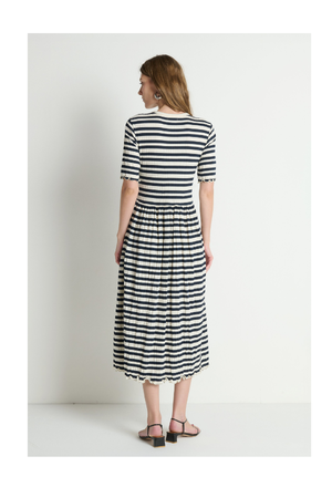 DETAILS: - Form fitting bodice with a full skirt. - Shell buttons - Model wears a S. - Placket detail - Length: 46 1/2" - 98% Cotton, 1% Poly, 1% Elastane Type: Dress Google product category 166 Google product category 166 Size ["gid://shopify/Metaobject/51988857137","gid://shopify/Metaobject/51988889905","gid://shopify/Metaobject/51988922673","gid://shopify/Metaobject/51988955441"] Description tag The Moosh client always likes a casual, easy to wear dress. The Claudine Midi Dress brings Mediterranean ease to the everyday with its form-fitting silhouette in textured jacquard crinkle jersey. Color ["Stripes"] Dresses jumpsuits style 1 ["Midi"] Dresses jumpsuit style 2 Smocked Bodice Tags: Dress, new-in-2, new-arrivals, midi, nation, not-sale, occasion-casual, occasion-date-night, occasion-day, occasion-everyday, occasion-night, size-l, size-m, size-s, size-xs, sleeve-short, vahi