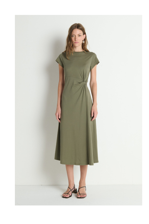 DETAILS: - An easy fit that is a little roomier than our signature slim fit, but not quite oversized. - Model wears a S - 100% Pima Cotton - Wear more, wash less. Machine washable. - Made in Peru Type: Dress Google product category 166 Google product category 166 Size ["gid://shopify/Metaobject/51988857137","gid://shopify/Metaobject/51988889905","gid://shopify/Metaobject/51988922673","gid://shopify/Metaobject/51988955441"] Description tag The Frida Twist Midi Dress keeps things casual, and easy to wear from day to night. A day shopping at Moosh or a picnic in the park, this classic tee dress is the perfect choice. Color ["Olive"] Dresses jumpsuits style 1 ["Midi"] Tags: Dress, new-in-2, new-arrivals, color-green, midi, moosh, nation, not-sale, occasion-casual, occasion-date-night, occasion-day, occasion-everyday, occasion-night, size-l, size-m, size-s, size-xs, sleeve-short, vahi