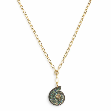 Hand-carved abalone shell pendant with natural blue and green iridescence, finished with a tiny faceted CZ in a gold bezel. Set on a gold-plated Y-style paperclip chain, adjustable 1618 inches. Lightweight and easy to layer for everyday wear. Made in the United States.
