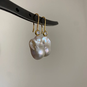Gold plated sterling silver findings with cubic zirconia and approximately 1" freshwater baroque pearl. Drop length: 1.75 inches.