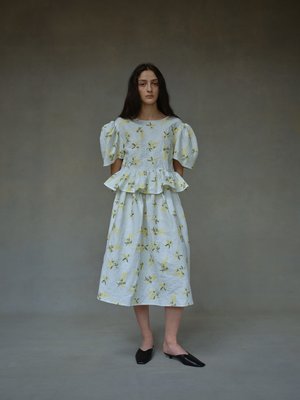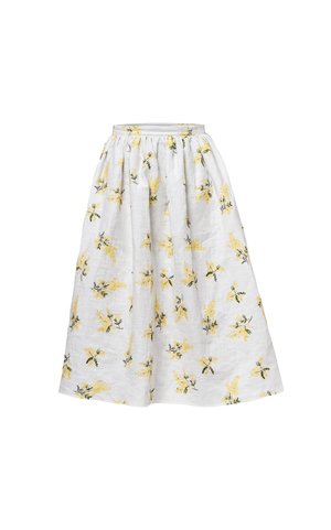 The Zena skirt is printed on cotton jacquard with ditsy yellow floral. It sits high on the waist with a delicate A-line silhouette. Make a beautiful impact and wear yours with the matching Anna top. Designed in London. Made in Ukraine. Colour: White / Yellow floral print Material + Care: 100% Jacquard Cotton. Gentle hand wash. Hang dry. Do not tumble dry. Size + Fit: Fits true to size. Model is a size UK 6.