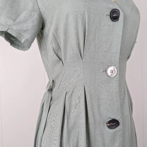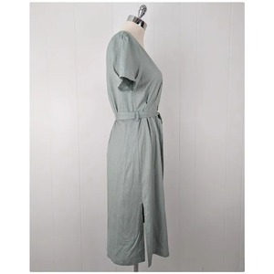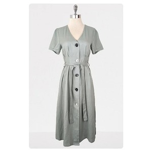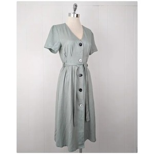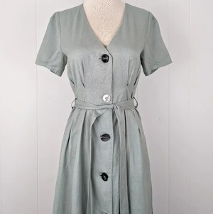 Brand: NEED Material: cotton linen blend Closure: button front Features: removable tie belt, mismatched buttons, pleated Labeled size: S - best fits XS-S 42" length 14" shoulder 34" bust 28" waist 40" hips 3" sleeve inseam Model size: 34-26-36 Condition: brand new with tags. Never worn. No flaws.