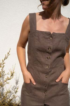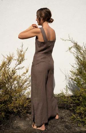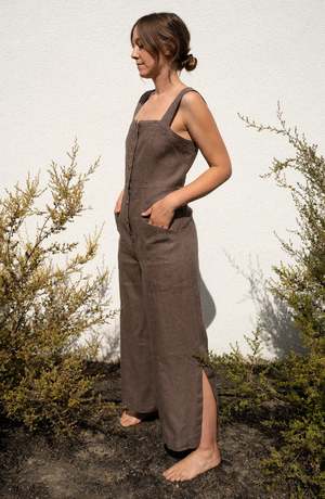 The Canyon Coverall is a relaxed fitting jumpsuit that like your favorite jeans will only get better with wear. Made of locally sourced garment-washed linen, it has a button closure on the front, wide bra-friendly straps, patch pockets on the hips, and slits on the side of each leg.
