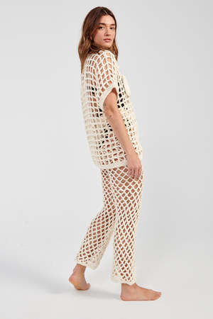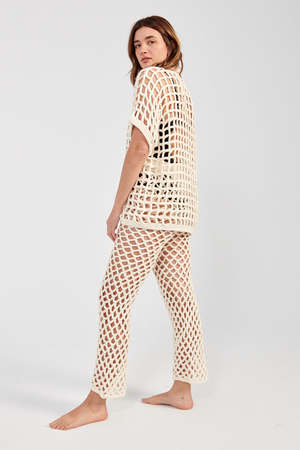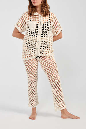 Unisex button up hand-crocheted shirt. Featuring a fully functioning patch pocket with mother of pearl shell buttons. Named after the Brazilian bossa-nova singer Sessa.