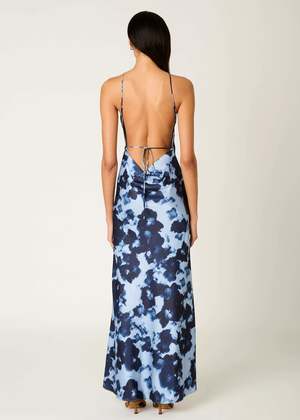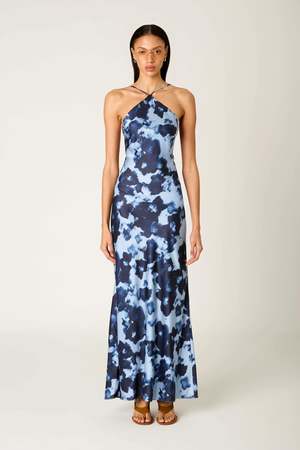 The Kelton Dress is fluid and refined, designed to highlight form with subtle elegance. Cut in a slip-style silhouette, it features a halter neckline with delicate crisscross straps and a softly draped cowl at the back that falls into a low open tie detail. A slightly flared hem adds movement to its floor-grazing length, while full lining ensures a smooth, sculpted fit. It's a quietly striking piece that transitions seamlessly from formal evenings to elevated occasions. Model is wearing a size small. S (2-4), M (6-8), L (10-12)