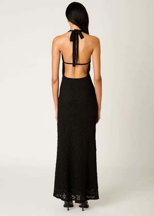 Designed to captivate with graceful impact, the Thalia Dress features a fluid column silhouette that skims the body with ease. A soft draped cowl neckline adds dimension to the textured lace fabric, while the open back is anchored by a thin horizontal strap.