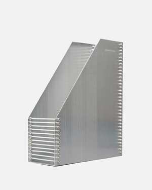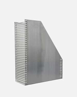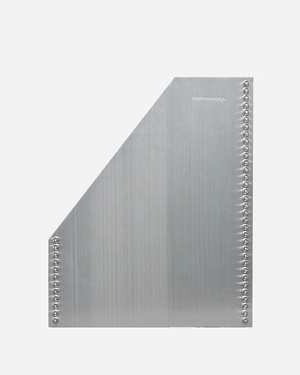 Niceworkshop bolt file box in silver. This file box is made of aluminum and features bolts across the front and back. There is a logo2 engraving detail on the side.