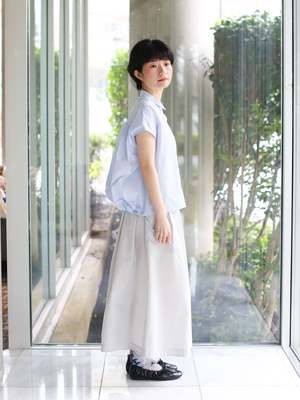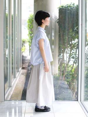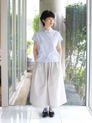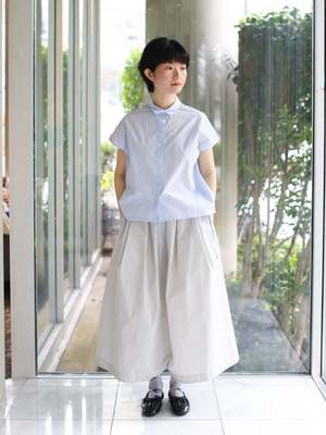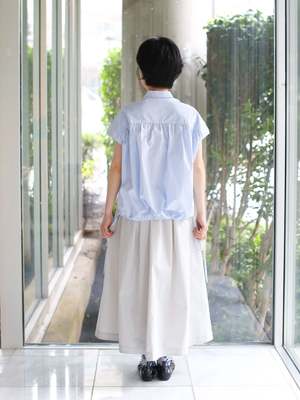 This blouse features a clean front with a small, refined collar, while the back is highlighted with generous gathers for added volume. The French sleeves create a delicate look for the arms, and the adjustable drawstring at the back hem adds expressive detail to the design. Cotton/Nylon Relaxed fit Gathered back and hem Button front SIZE (cm) 36: Chest 146, Overarm 66, Length 65.5 38: Chest 150, Overarm 67.5, Length 67.5 69% cotton, 31% nylon Made in Japan