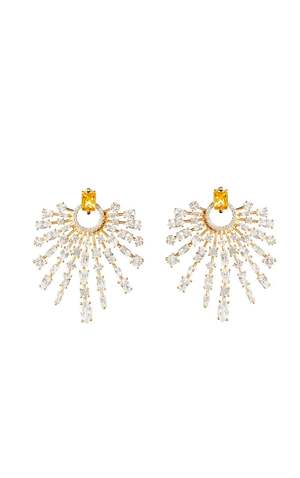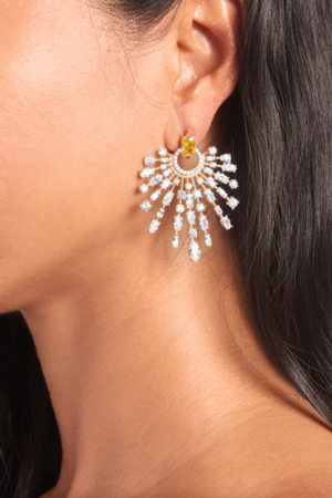 The Holly earrings are like a burst of energy and a ray of sunshine. Bold and festive, wear them to your next social gathering. Fabric: 14k Gold Vermeil Clean and Yellow Crystals Nickho Rey Jewelry has a base metal of 925 Sterling Silver and is plated in either 14K Gold, Rose Gold, or White Rhodium. To ensure the piece's longevity, plated jewelry should not be worn while swimming, bathing, exercising, or when applying perfumes, lotions, or hair products. To clean your plated jewelry, use a soft cloth and gently wipe (do not buff) the surface. It is okay to clean with jewelry cleaner and dry thoroughly thereafter. When not wearing your piece, it is best to store it in the provided pouch. Measurements: Drop: 44.5mm